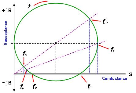 谐振频率及反谐振频率, fr and fa , 分别是当电导等於零(纯电阻特性)的二个频率. 在这个时候, fr 的阻抗为 1 / Rr 而fa 的阻抗为 1/ Ra.