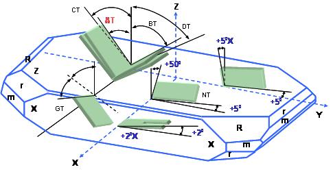 在各种不同种类的切割角度方式中, AT角度切割的石英晶片适用在数MHz到数佰MHz的频率范围,是石英晶片应用范围最广范及使用数量最多的一种切割应用方式. 在(图五)中, 从石英晶棒X-轴向的上视图, 可以看到对Z-轴向旋转约35度的AT 方向. 这在大量生产的技术上也是很好达成的一种作业方式.