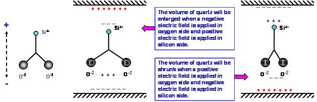 石英材料中的二氧化矽分子(SiO2) 在正常状态下, 其电偶极是互相平衡的电中性. 在(图二左)的二氧化矽是以二维空间的简化图形. 当我们在矽原子上方及氧原子下方分别给予正电场及负电场时, 空间系统为了维持电位平衡, 两个氧原子会相互排斥, 在氧原子下方形成一个感应正电场区域, 同时在矽原子上方产生感应负电场区域. 相反的情况, 当我们在矽原子上方及氧原子下方分别给予负电场及正电场时, 两个氧原子会相互靠近, 氧原子下方产生感应负电场,矽原子上方产生感应正电场. (图二). 然而, 氧原子的水平位置变化时, 邻近的另一个氧原子会相对的产生排斥或吸引的力量, 迫使氧原子回到原来的空间位置. 因此, 电场的力量与原子之间的力量会相互牵动, 电场的改变与水平方向的形变是形成交互作用状态. 这个交互作用会形成一个在石英材料耗能最小的振动状态, 祇要由电场持续给与能量, 石英材料就会与电场之间维持一个共振的频率.