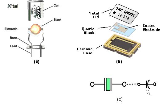 (图七)(a)及(b)分别是DIP型式及SMD型式的石英振荡子的基本结构图. (图七)(c)是电子电路上所使用代表石英振荡子的电子符号. 当石英晶体共振子处在远离振荡频率区域时, 石英晶体共振子仅是一个电容性的元件, 当频率接近石英晶体的振荡频率时, 就接近是一个电感性的等效LCR振荡线路.