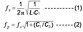 在评估共振时的等效线路时, 串联谐振频率及并联谐振频率, fs and fp , 是最重要的二个频率参数. 对於串联谐振频率及并联谐振频率( fs and fp )二者的关系, 我们可以用下列公式来表达: