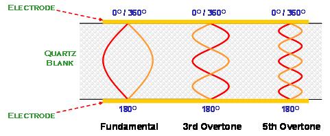 在AT切割角度的石英晶体共振子主要是以厚度剪切振荡模态存在. 石英晶体在共振时, 除了基本波振荡之外, 高阶的倍频共振也与基本波振荡同时存在於石英晶体的电极区域之间. 但是, 由於压电材料的电极是电气相位相反的振动环境, 所以, 祇有奇数倍(odd number)的高频倍频可以发生, 偶数倍(even number)的倍频共振在石英晶体共振子是不会存在的(图十).