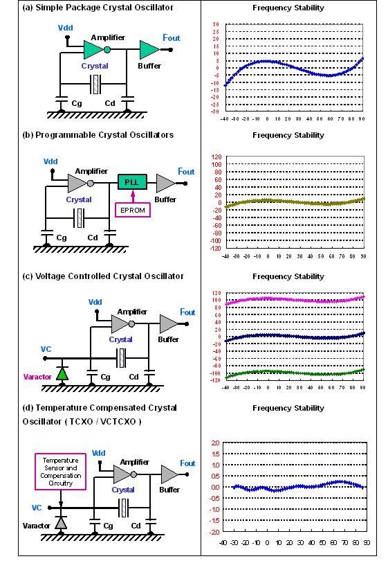 为了满足应用面需求而言, 石英晶体振荡器内部的振荡线路有以基本波或三倍频不同方式. 若要达到数佰兆赫的输出频率时, 振荡线路後级可以采用锁相回路方式或倍频方式, 将较低频率的石英振荡频率提升. 对於输出端的输出准位及输出波形也有各类不同需求,如 CMOS, LVPECL, LVDS…..等. 这些规格都要仔细的定义.