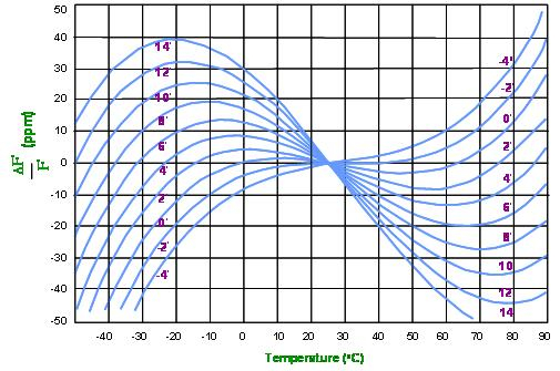 在(图十二)提供了数种石英振荡器输出频率对温度变化的稳定性示义图