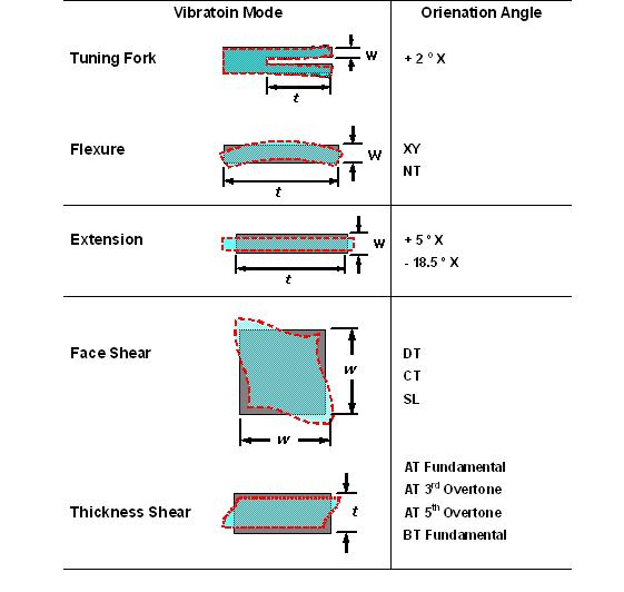 经由不同的石英切割角度及不同电极型状的电场效应, 石英晶片展现了各种不同的振动模态. 以经常产生的振动模态可以概分为扰曲模态(flexure mode), 伸缩模态(extension mode), 面剪切模态(face shear mode) 和 厚度剪切模态(thickness shear mode). 这几种振动模态以简单的方法在表一中可以看到. 在实际状况中, 石英晶片并不是一定祇有单一种振动模态, 而可能有多种模态同时存在在一个石英晶片的振荡中, 经由适当的设计, 可以压制其他不希望产生的振动模态(unwanted mode), 来达到主要振动模态的最佳化.